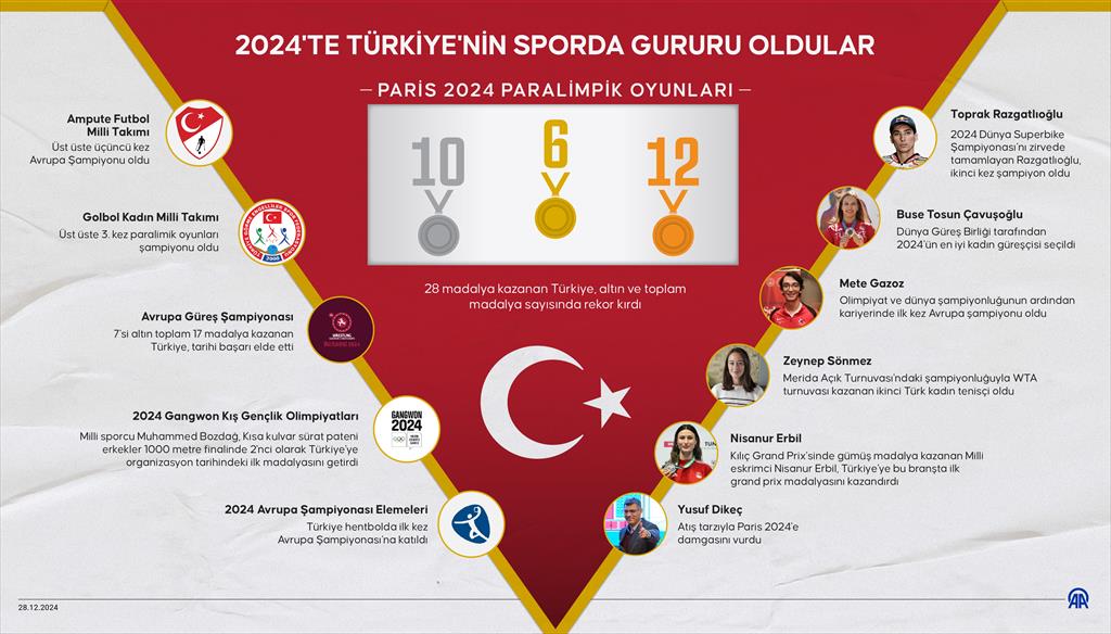 2024 yılı, Türk sporunun ulusal ve uluslararası arenada büyük başarılar elde ettiği bir yıl oldu. Ampute Milli Futbol Takımı, tarih yazmaya devam ederken, golbol Kadın Milli Takımı da kazandığı başarılarla gurur kaynağımız oldu. AVRUPA Güreş Şampiyonası'nda Türk güreşçileri önemli dereceler elde etti. Ayrıca, 2024 Gangwon Kış Gençlik Olimpiyatları'nda Türk sporcuları dünya çapında başarılar gösterdi.Bunun yanı sıra, Avrupa Elemeleri'nde Türkiye'nin yetenekli sporcuları da dikkat çekti. Toprak Razgatlıoğlu, motosiklet yarışlarında dünya çapında bir başarıya imza atarken, Buse Tosun, Cavuşoğlu, Mete Gazoz, Zeynep Sönmez, Nisanur Erbil ve yusuf dikeç gibi sporcular da çeşitli branşlarda Türkiye'yi gururlandırdı. Bu sporcular, 2024'teki başarılarıyla Türk sporunun yükselen yıldızları olarak adlarından söz ettirdi.
