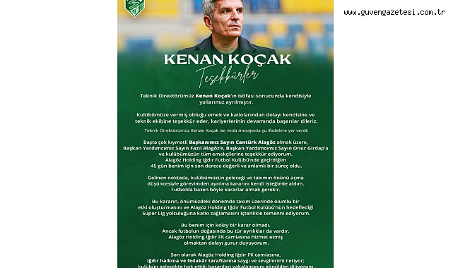 Koçak, Alagöz Holding Iğdır Futbol Kulübü’nde geçirdiği yaklaşık 45 günlük sürecin kendisi için oldukça değerli ve anlamlı olduğunu belirterek, görevinden ayrılma kararını kulübün geleceği ve takımın önünü açma düşüncesiyle kendi isteğiyle aldığını dile getirdi. Futbolda zaman zaman bu tür kararların alınabileceğini ifade eden Koçak, ayrılığın kolay bir karar olmadığını ancak kulübün hedefleri doğrultusunda böyle bir adım attığını kaydetti.