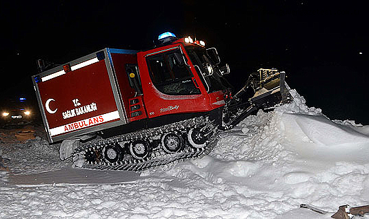 Çetin kış şartlarının etkili olduğu Erzurum'da görevli sağlık ekipleri, yolu kardan kapanan yerleşim yerlerindeki hastalara "snowtrack" ambulansla ulaşıyor.Yılın yaklaşık 6 ayı karla kaplı bulunan kentte, olumsuz hava koşullarında da sağlık hizmetlerinin aksamaması için yoğun çalışma yürütülüyor. Özel donanımlı ambulansların yanı sıra snowtrackla da her türlü koşulda hastalara yetişen sağlık ekipleri, kışın yolları kardan kapalı yerleşim yerlerindeki hastalara umut oluyor.Kentte görevli sağlık çalışanları, 112 Acil Çağrı Merkezi'ne gelen acil ihbarlar üzerine en az 4 kişilik ekiple harekete geçiyor. Doktor, 2 sağlık personeli ve şoförden oluşan ekip, tıra yüklenen snowtrack ambulansla yardım istenen adrese doğru kısa sürede yola çıkıyor.Yolun kullanılabilir noktasına kadar tırla giden ekip, kardan kapalı noktayı tespit ettikten sonra ise snowtrack ambulansla hastaya ulaşmaya çalışıyor.- Snowtrackla karın 1 metreyi bulduğu yolları açıp ilerliyorlarYollardaki uyarı tabelalarıyla yönlerini bulan ekip, şiddetli tipi nedeniyle kar kalınlığının yer yer 1 metreyi bulduğu yolları açıp, yardım isteyen kırsal mahalle ve mezralardaki hastalara ulaşıyor.Ekip, olay yerindeki müdahalenin ardından hastayı paletli ambulansla alarak en yakın hastanede tedavi altına alıyor.İl Ambulans Başhekimi Dr. Furkan Soner Taş, AA muhabirine, karlı yolları aşıp, vatandaşlara sağlık hizmeti vermek için mücadele ettiklerini söyledi.Mevsimin bazı aylarında Tekman ve Çat ilçelerinden gece saatlerinde şiddetli tipi ile karşılaştıklarını belirten Taş, "Erzurum kış memleketi, bu sebeple 2-3 metre yüksekliğindeki karlı yollarla mücadele ediyoruz. Bunu yaparken devletimizin bize sağladığı imkanlarla zorlu şartlarda hizmet veriyoruz." dedi.- "Ulaşamadığımız hiçbir yer yok"Vatandaşın sağlığı için her türlü araziyi aştıklarını vurgulayan Taş, şunları kaydetti:"Bu hizmeti verirken snowtrack aracımızı kamyonetin üzerine yüklüyoruz. Yolun açık olduğu kısımları tırla, karla kaplı tırla ilerleyemediğimiz kısımlarını da snowtrack aracımızı indirip onunla devam ediyoruz. Metrelerce yükseklikte karlı yolların üzerinden kar üstü paletli snowtrack aracımızla ulaşım sağlıyoruz. Elimizden gelenin en iyisini yapmaya çalışıyoruz. Kışın başından beri snowtrack aracımızla 15 vatandaşımıza hizmet verdik. Her yıl ortalama 70-80 vakaya bu şekilde ulaşıyoruz. Ekiplerimiz her türlü vakaya profesyonelce müdahale ediyor. Devletimizin bize sunduğu imkanlarla vatandaşımıza ulaşıyoruz, kontrolsüz başlayan süreçleri kontrol altına almaya çalışıyoruz. Ulaşamadığımız hiçbir yer yok."Çat ilçesinin kırsal Soğuk Pınar Mahallesi'nde ailesiyle yaşayan ve snowtrack ambulansla yüz felci geçiren kızını ekiplerle hastaneye yetiştiren Sebahattin Yıldız da yollarının şiddetli tipi nedeniyle kapandığını anlatarak, "Mahallemiz ilçe merkezine yaklaşık 9 kilometre uzaklıkta yolumuz hep yokuş, devamlı kar ve tipi oluyor. Yaklaşık 1 metre kar var bazı yerlerde daha fazla. 2 gündür yollarımız kapalı, hastam fenalaştı, 112'yi aradım, Allah razı olsun ekipler geldi, bizi aldılar ve hastaneye getirdiler." diye konuştu.ANADOLU AJANSI