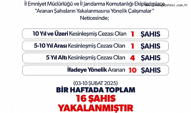 Iğdır İl Emniyet Müdürlüğü ve İl Jandarma Komutanlığı ekiplerinin ortaklaşa yürüttüğü “Aranan Şahısların Yakalanmasına Yönelik Çalışmalar” sonucunda, 03-10 Şubat 2025 tarihleri arasında toplam 16 şahıs yakalandı.