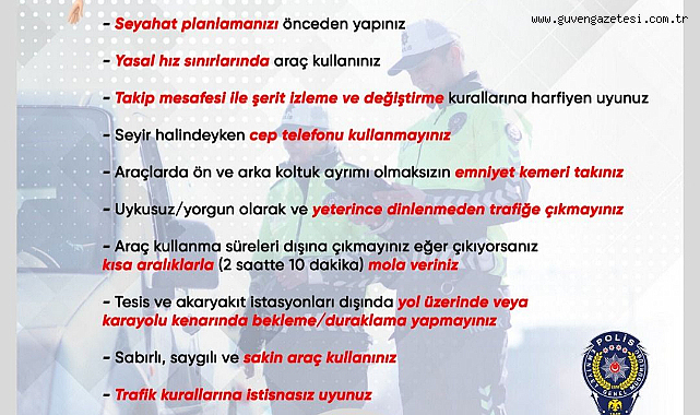 Emniyet yetkilileri, dönüş yolculuğuna geçen vatandaşların can ve mal güvenliğini tehlikeye atmadan, sevdiklerine sağlıkla kavuşmaları için özellikle emniyet kemeri kullanımı, aşırı hızdan kaçınma ve dinlenmeden uzun süre araç kullanmama gibi temel kurallara hassasiyet göstermeleri gerektiğini ifade etti.