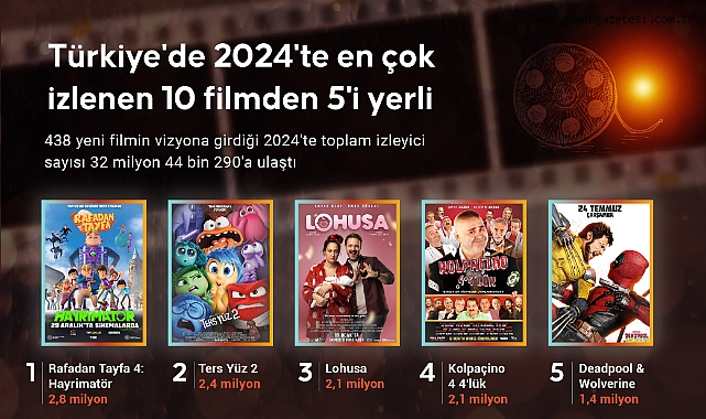 Magazin Yayınlanma: 28 Aralık 2024 - 11:15 Türkiye'de 2024'te en çok izlenen 10 filmden 5'i yerli Magazin 28 Aralık 2024 - 11:15 Yorumlar A Büyüt A Küçült Yorumlar DOĞUKAN BEY Bu haber 804 defa okunmuştur. # turkiye# sinema# en çok izlenen 10 film# film önerisi EDİTÖR Güven Gazetesi YORUMLAR FACEBOOK adlı kullanıcıya cevap x Gönder ANASAYFAYA DÖNMEK İÇİN TIKLAYINIZ İlginizi Çekebilir KISKANMAK DİZİSİNİN YENİ BÖLÜMÜ NE ZAMAN? Kıskanmak dün akşam neden yoktu? ZARA LARSSON TÜRKİYE KONSER BİLETİ: Zara Larsson Konseri Ne Zaman, Nerede? Konser Bilet Fiyatları Ne Kadar? Kübra Ünlü yazdı! Eşref Rüyada bu akşam her şey değişiyor! 14 NİSAN REYTİNG SONUÇLARI 2026 | Reyting Birincisi Kim Oldu? A.B.İ, Mehmed:Fetihler Sultanı Reyting Sonucu Eşref Rüya fırtınası her yerde 15 NİSAN REYTİNG SONUÇLARI | Reyting Birincisi Kim Oldu? Eşref Rüya, Kuruluş Orhan, Yeraltı, Güldür Güldür, Avcı: Kış Savaşı, Survivor 15 Nisan Reyting Sonucu EUPHORIA 3. SEZON İZLE: Euphoria 3. sezon çıktı mı, ne zaman çıkacak? Yeni sezon nereden izlenir? GASSAL 3. SEZON İZLE: Tabii Gassal 3. Sezon Yayınlandı Mı? Yeni Sezon Nereden İzlenir? TAŞACAK BU DENİZ 25. BÖLÜM 2. FRAGMAN İZLE: TRT 1 Taşacak Bu Deniz Yeni Bölüm Fragmanı Yayınlandı Mı? Fatih Furtuna Kim Oldu? TAŞACAK BU DENİZ BU HAFTA YOK MU? TRT1 Taşacak Bu Deniz 25. Bölüm 2. Fragman Yayınlandı Mı? 17 Nisan TRT 1 Yayın Akışı Bandırma Füze Kulübü filminin konusu nedir? Bandırma Füze Kulübü filminin oyuncuları kimler? Halef Köklerin Çağrısı bu akşam var mı yok mu? 16 Nisan Halef dizisi bu akşam yayınlanacak mı? ilan.gov.tr Iğdır İlçeleri Aralık Iğdır Karakoyunlu Tuzluca ADIYAMAN - Bir köy kuduz nedeniyle karantinaya alındı ADIYAMAN - Bir köy kuduz nedeniyle karantinaya alındı