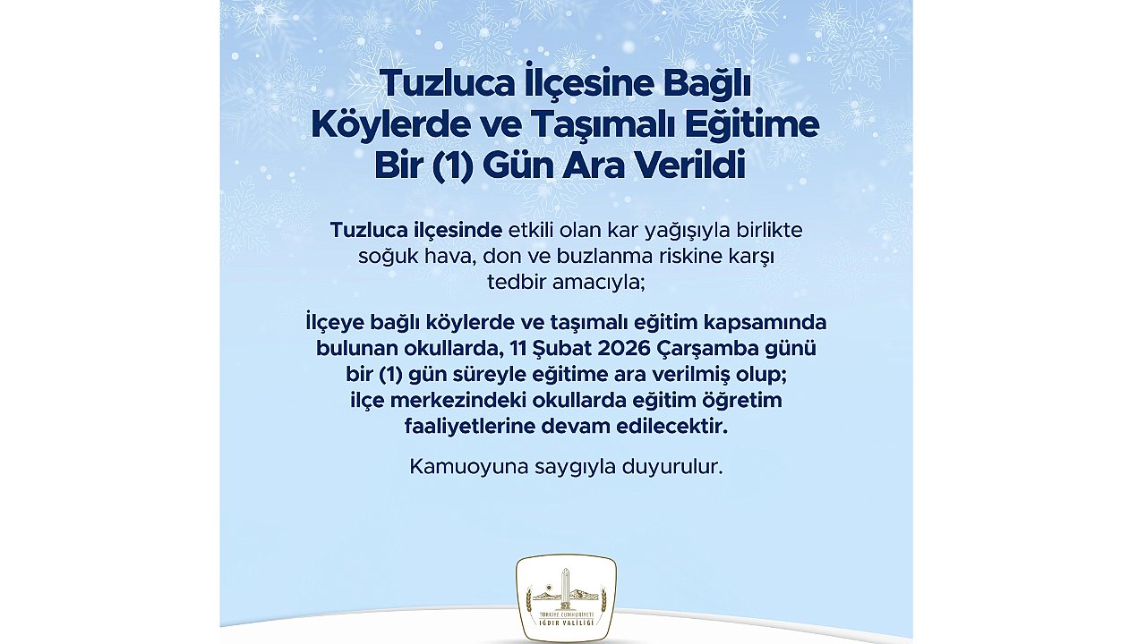 Iğdır Valiliği tarafından yapılan resmi açıklamada, Tuzluca ilçesine bağlı köylerde bulunan okullar ile taşımalı eğitim kapsamında öğrenim gören öğrenciler için 11 Şubat 2026 Çarşamba günü eğitim öğretime bir (1) gün süreyle ara verildiği duyuruldu. Açıklamada, kar yağışıyla birlikte soğuk havanın etkisini artırdığı, don ve buzlanma olaylarının özellikle sabah ve akşam saatlerinde ciddi risk oluşturduğu vurgulandı.