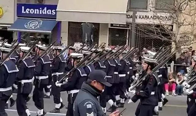 Yunanistan'ın başkenti Atina'da 25 Mart'ta yapılan resmi geçit töreninde, Türkiye karşıtı slogan atan Yunanistan Deniz Kuvvetleri mensuplarının...